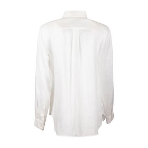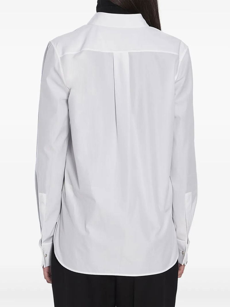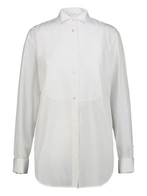 White, front button fastening, spread collar, long sleeves, buttoned-cuff sleeves.