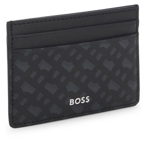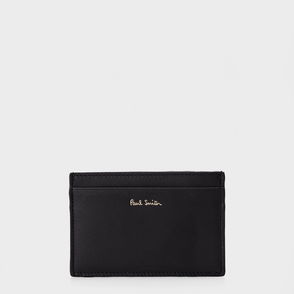 Buffed calfskin card holder in black. · Logo embossed at back face· Accordion panel at sides · Press-stud tab closure· Four card slots· Grained sheepskin lining· Logo-engraved silver-tone hardware·