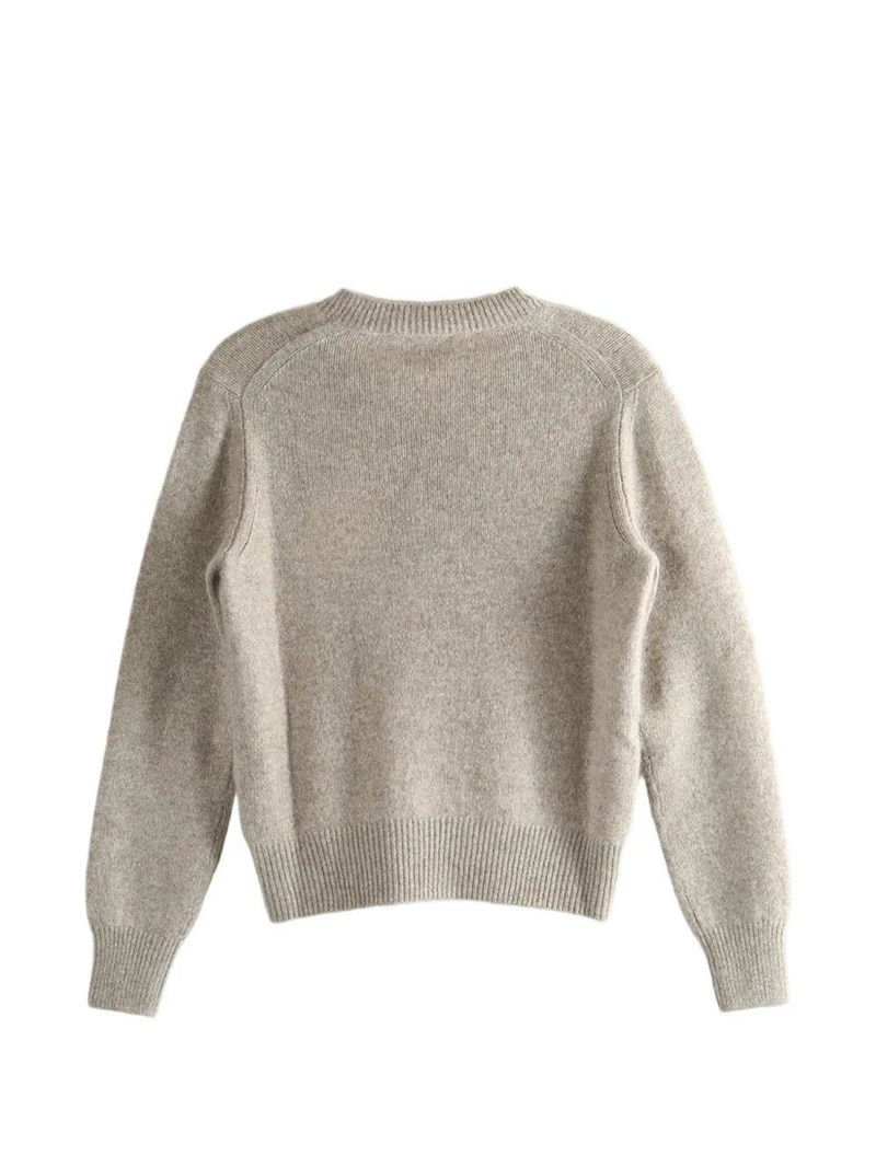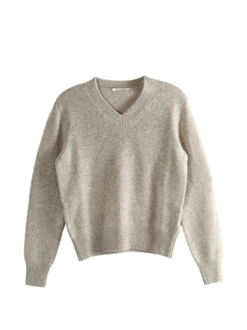 Beige cashmere ribbed cuffs and hem long sleeves V-neck.