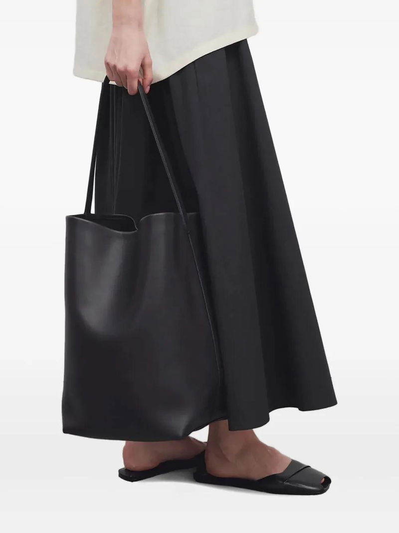 Black curved shoulder strap soft silhouette minimalistic design spacious interior seamless edges.