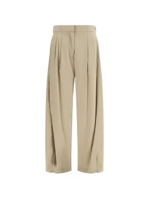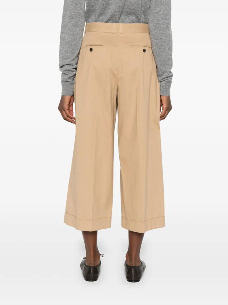 Sand pleated front belt loops turn-up cuffs wide leg cropped length.