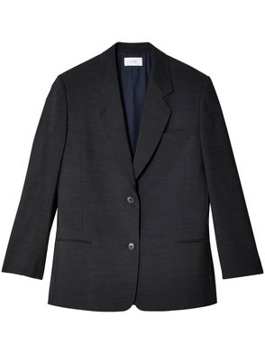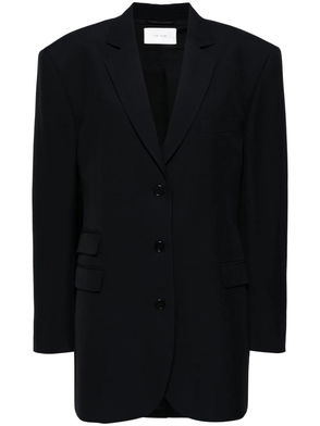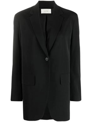 Black wool notched lapels buttoned cuffs front button fastening front flap pockets.