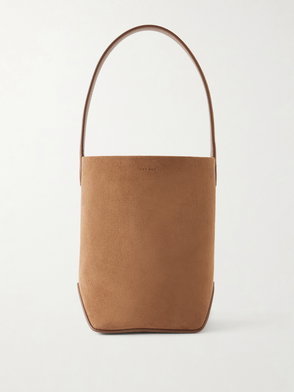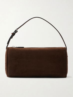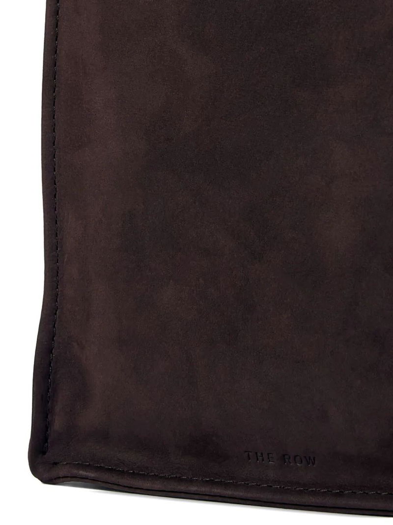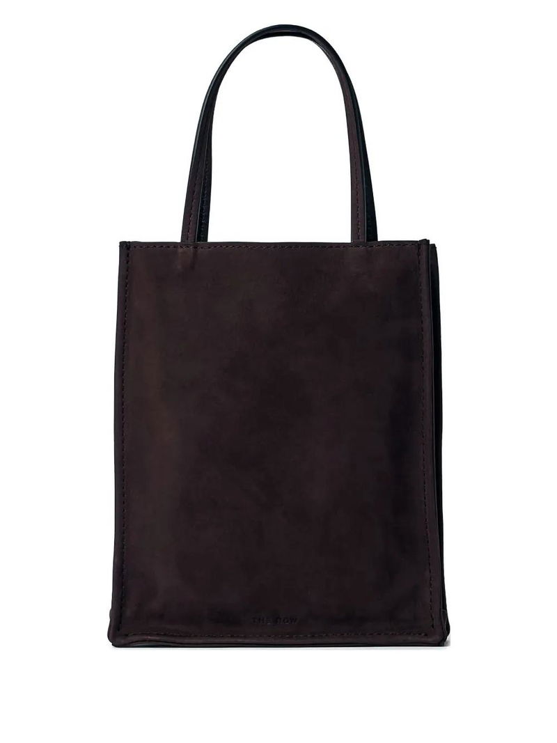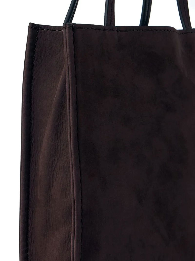 Brown suede finish two top handles open top single main compartment top stitching.