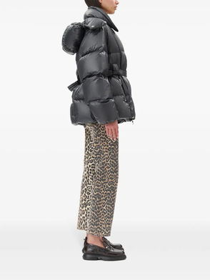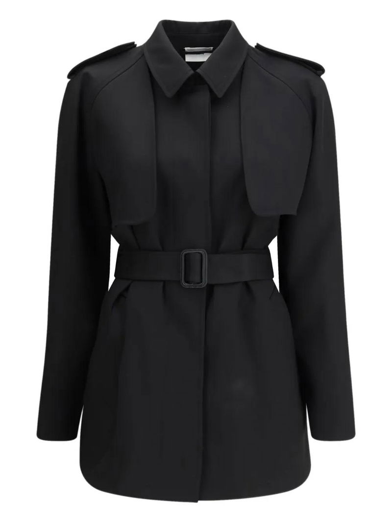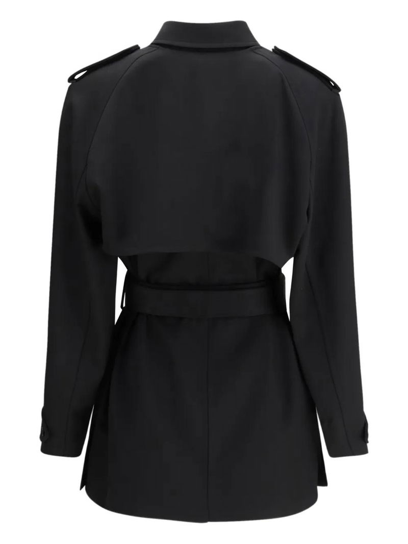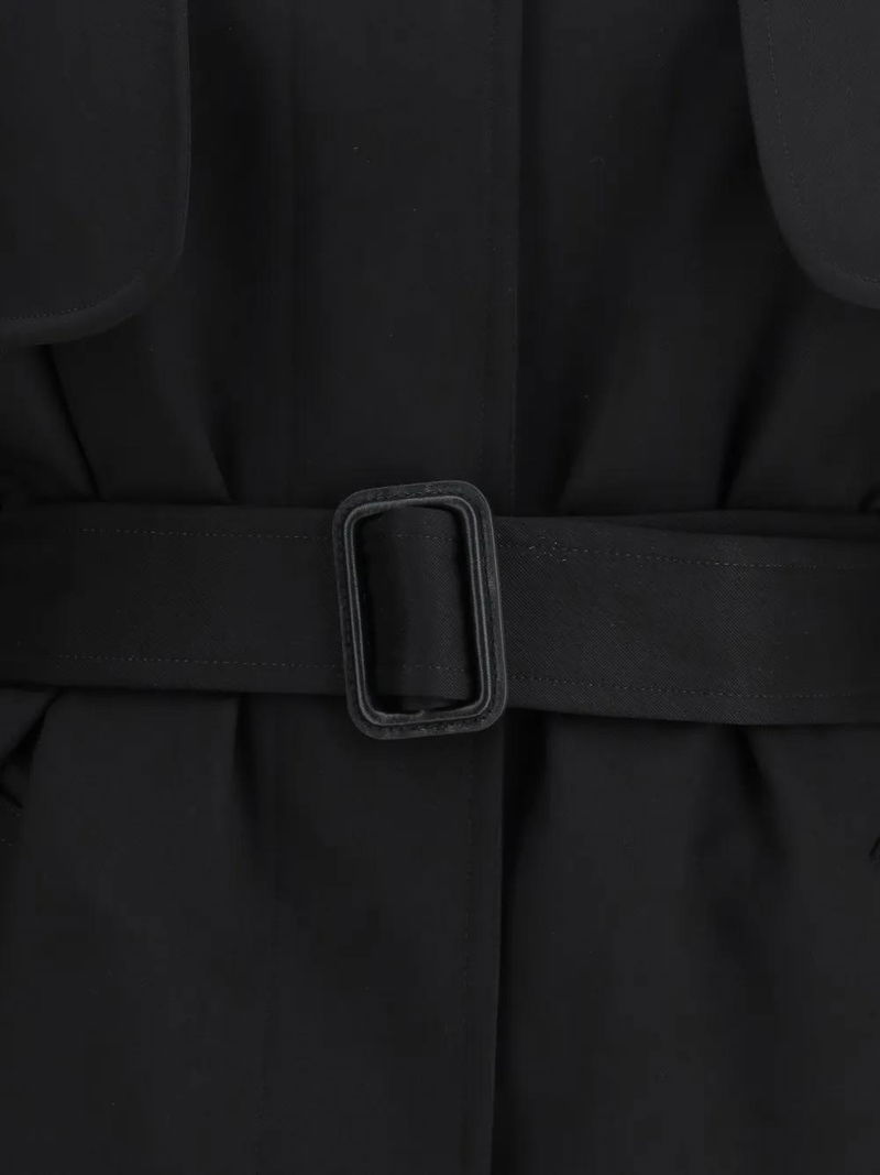 black, detachable sleeves, belt buckle, welt pockets, concealed front button closure.