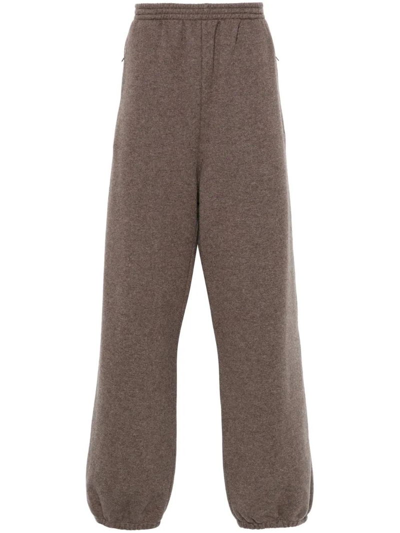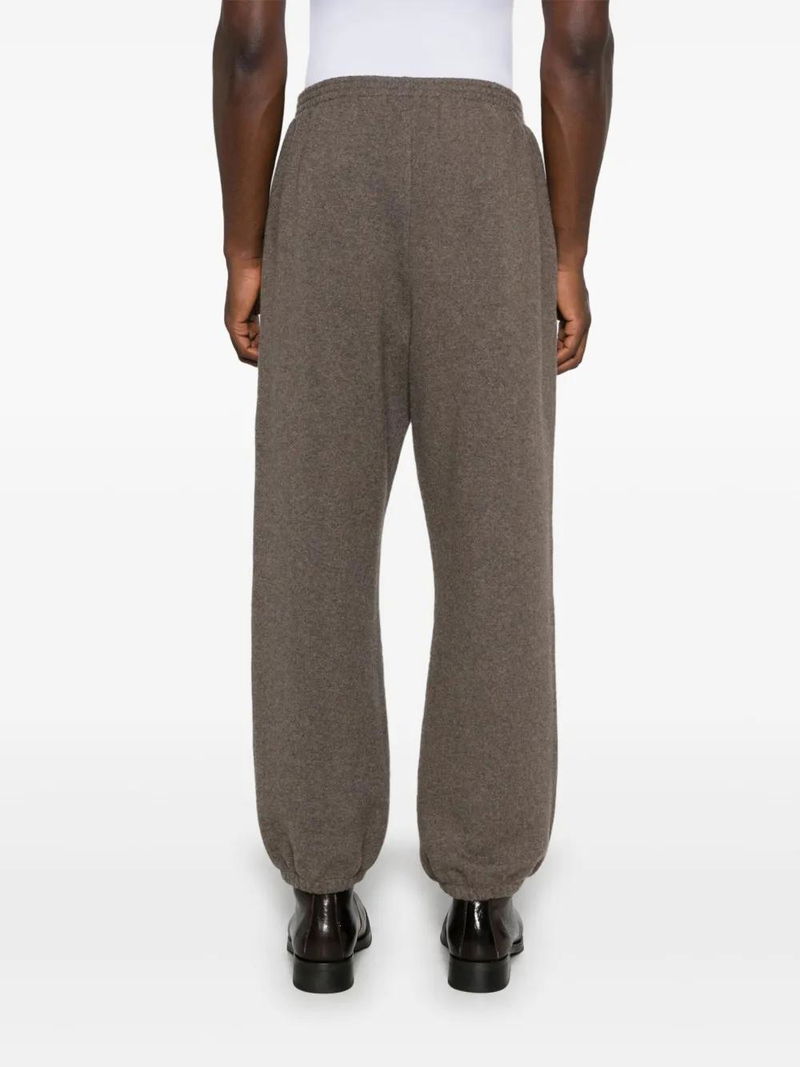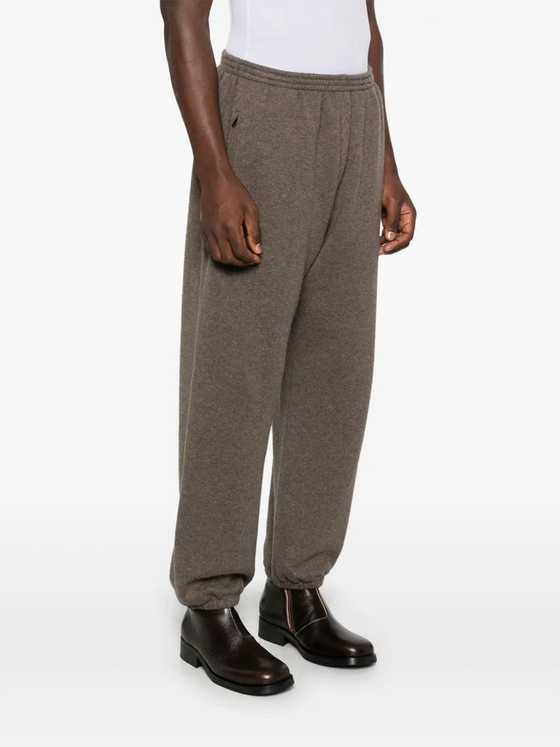 Brown cotton-cashmere blend mélange effect fleece texture elasticated waistband two side zip-fastening pockets tapered leg elasticated cuffs.