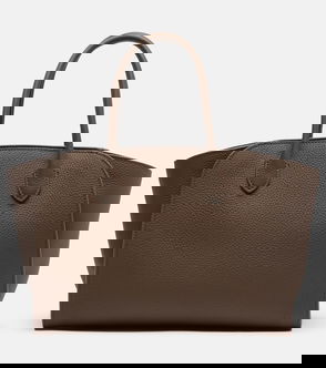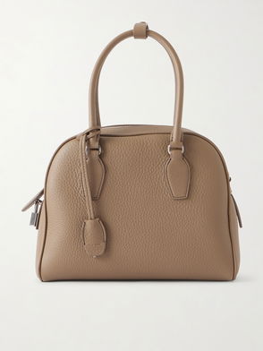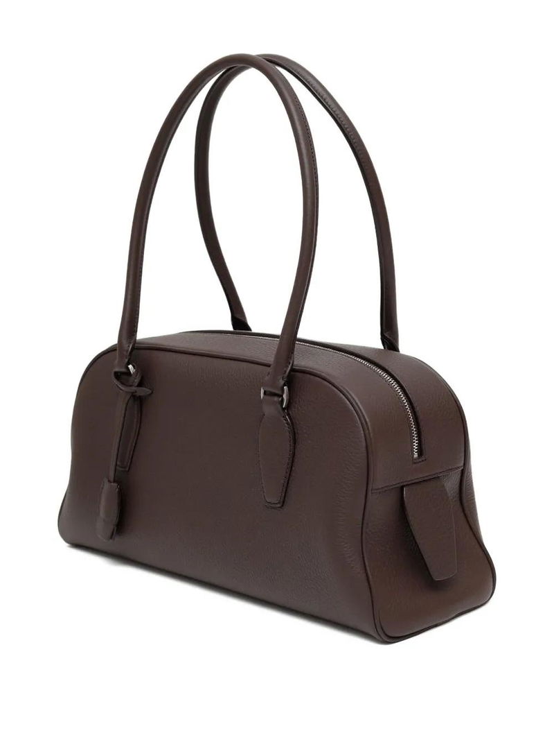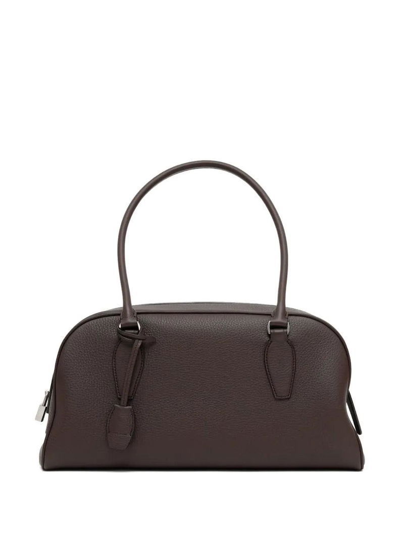 Deep brown top handles zip fastening padlock detail grained texture silver-tone hardware.