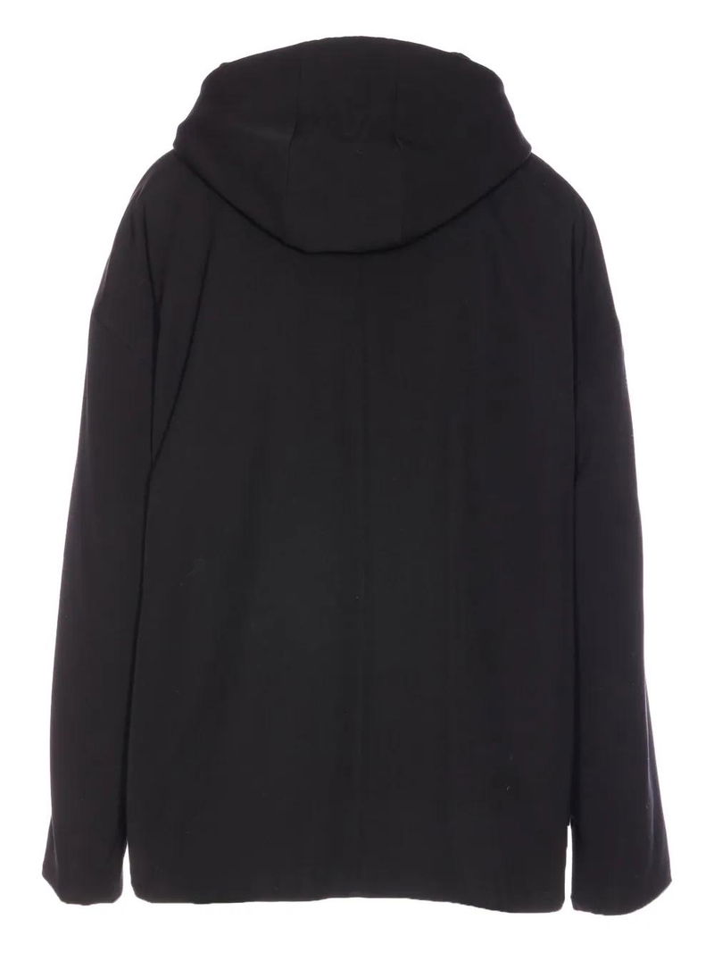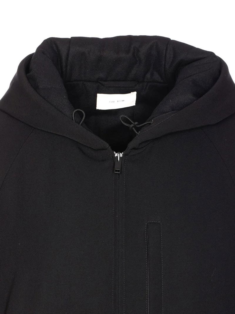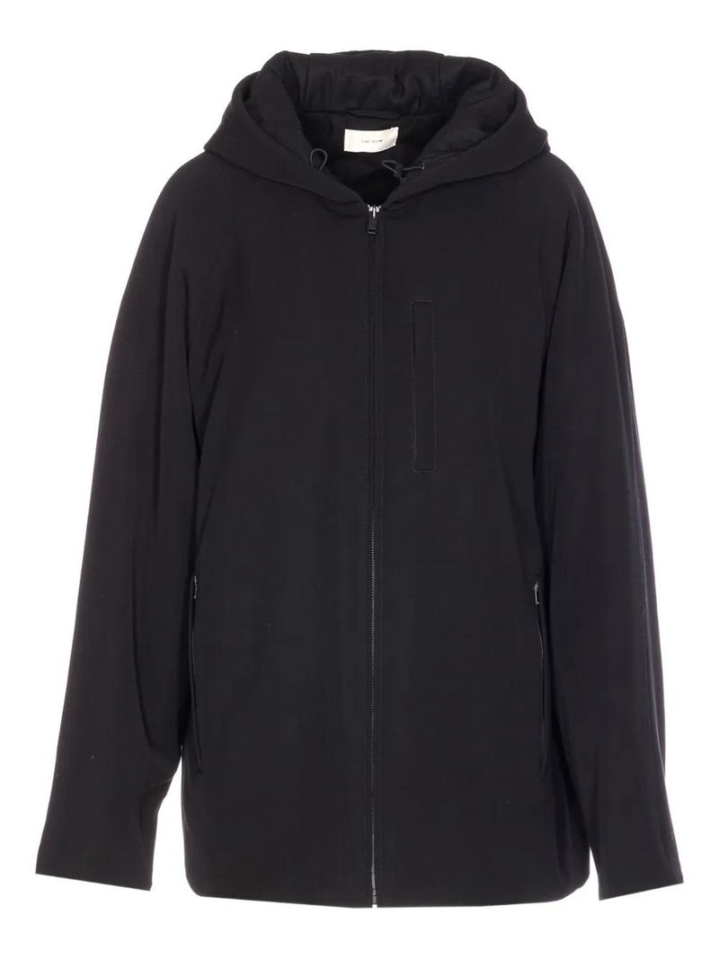 Black, hooded, zip fastening, zip pockets, long sleeves.