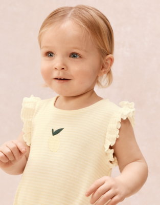 This delightful baby romper is perfect for little ones on sunny days. Made from super soft pure organic cotton with a gentle hand feel it features cheerful yellow and white stripes throughout. We love the sweet lemon embroidery at the centre and the pretty frill details on the armholes for an extra-special touch. The mock wood branded buttons down the back add a premium finish while the elasticated cuffs at the legs ensure a comfortable fit. Roomy and comfy it's an ideal one-piece for everyday baby adventures.