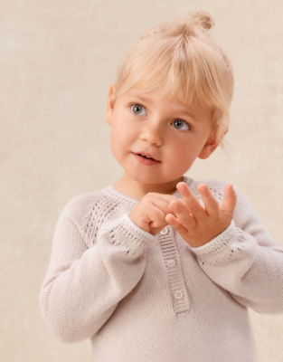 This knitted baby romper keeps little ones cosy and looking charming. Made in blossom pink with an intricate pointelle stitch pattern on the raglan sleeves. Buttons down the legs allow easy nappy changes while pointelle cuffed legs add a sweet touch. Two patch pockets on the front complete this adorable piece.