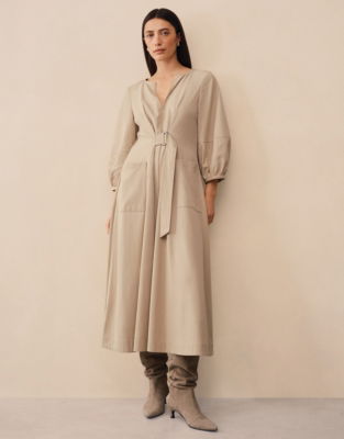 With a fluid midi-length skirt it's cinched in at the waist with a half-belt detail. With a deep narrow V-neckline and wide blouson bracelet-length sleeves it's all about the flattering details.