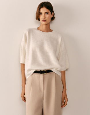 This contemporary boxy T-shirt style is designed to be loose and flowy and makes a great piece to pair in the evening with a silk skirt creating a delightful play on different fabric textures. It has a simple crew neck and flowy sleeves that fall to the elbow.
