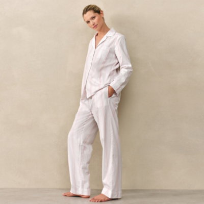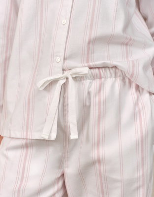 Ultra-comfy brushed cotton that feels velvety soft to the touch and cosy from the moment you put it on. These PJs are decorated with a multi-stripe pattern in serene pale pink on an ivory base. The button-up skirt has a classic collar design and single breast pocket on the front as well as mother-of-pearl. The pull-on trousers have an elasticated waist with ivory ties.