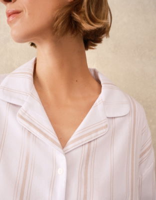 Ultra-comfy brushed cotton that feels velvety soft to the touch and cosy from the moment you put it on. These PJs are decorated with a multi-stripe pattern in serene neutral shade on an ivory base. The button-up shirt has a classic collar design and two patch pockets on the front as well as mother-of-pearl buttons. The pull-on trousers have an elasticated waist with ivory ties.
