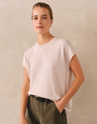 One of our most popular shapes back for the season with new colourways. We love this simple flattering top for its total versatility - great worn over jeans with a skirt even over a dress. In an easy airy shape with flattering extended shoulders that fall on the diagonal and simple ribbed trims at the edges.