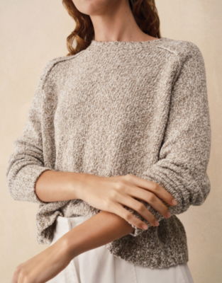 The mouliné yarn gives it a gentle depth to the colour while the deep- ribbed trims add a satisfying touch of chunkiness. Exposed seams along the saddle shoulder add a contemporary edge.