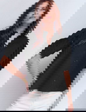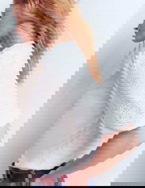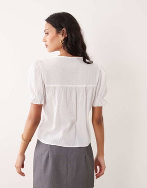 In classic boho style this floaty blouse has all-over floral cutwork embroidery. Neat details like gathers on the neck and a slightly stepped hem add shape while the bracelet-length sleeves with a shorter overarm create an angled sleeve. The keyhole neckline has rouleau ties (matched on the cuffs) - style it open or tied with a bow.