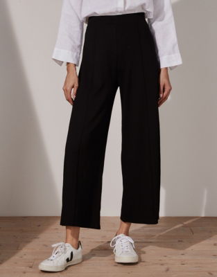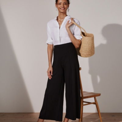 Our wide-leg trousers are a true wardrobe staple. Available in timeless black navy and ivory pair them with a tee and trainers for off-duty ensembles or add a blouse and ankle boots for a more polished look.