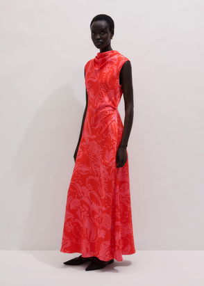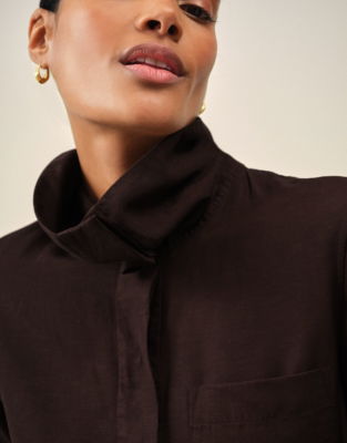 It's all about the elegant neckline which can be worn buttoned up in a collapsed funnel-neck style or left open to create a beautiful wide collar. It also has a belt in the same fabric so you have the choice between a belted or unbelted look. Matching design in a shirt available.