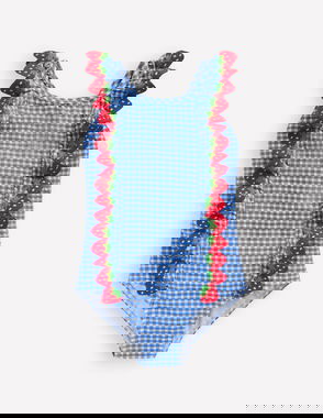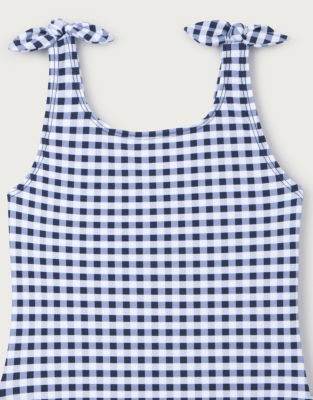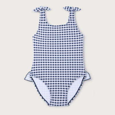 This sweet girls' swimsuit is perfect for sunny beach or pool days. Featuring a classic white-and-navy-checked pattern it has fixed bows on the straps and a ruffle detail across the scoop back. The SPF-protection in the material keeps skin safe during water play. Perfect for any little girls' summer wardrobe.