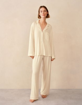 Our jersey PJs come in a soft drapey material for the most comfortable bedtimes. In a soft creamy shade of macadamia they come in our classic button-up shirt and bottoms shape with a neatly rounded collar and a pocket on the chest and they are finished with piping around the edges. The waistband is elasticated for comfort with no tie leaving a clean sleek silhouette.