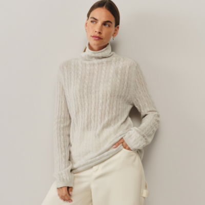 The luxurious cashmere cable knit is a cosy layer for chillier months. The slouchy funnel neck is 'grown-on' (rather than being attached with a seam) which creates a more flattering streamline shape.