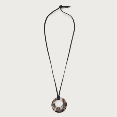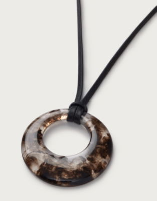Our statement necklace has a round resin pendant threaded onto a black leather cord. It looks great layered with any casual daytime outfit. The resin is hand-poured so each piece is individual and unique yet always with a dark tonal marbling effect that looks refined and stylish. Plus it's easily adjustable so you can find the perfect length to suit different necklines. Coordinate with the matching ring. Together makes a thoughtful gift.