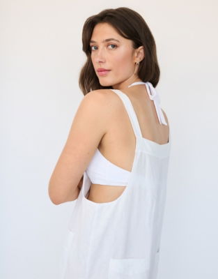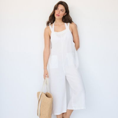 Our pinafore-style linen jumpsuit is a versatile all-in-one piece. Easy to wear it features an oversized silhouette a stylish square neckline and cropped wide-leg trousers. Holiday-ready this style looks lovely worn over a T-shirt and doubles as a swimwear cover-up too.
