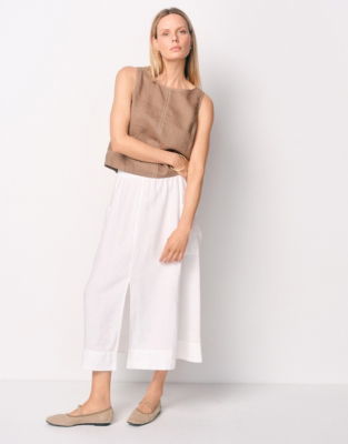 Cool and casual this midi skirt is a go-to style for holiday dressing. Made from pure EUROPEAN FLAX® linen it has a lightweight floaty feel that we love during warm weather and a contemporary centre-front split. It features an elasticated waistband for comfort detailed with top stitching for a premium finish. A large patch pocket at the side gives it a utility feel for a contemporary twist.