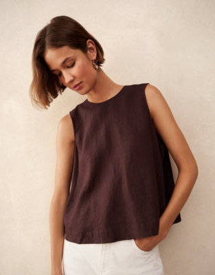 Inspired by our staple button-back shell top we've refreshed the design with a button-and-rouleau keyhole on the back and shoulder tucks going into the armholes for added volume. The top is slightly cropped for a contemporary silhouette. To keep things simple wear with wide-leg linen trousers for a coordinated look style with our full midi skirts or keep it casual with a pair of jeans.