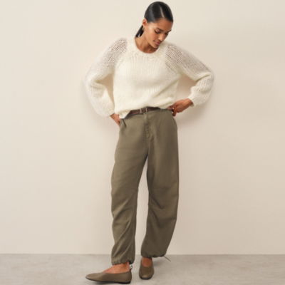 It's the loose chunky stitch that makes this jumper feel so special - wide and airy with a one-off homespun feel. It's knitted 'off-gauge' which is what creates that oversized-stitch effect emphasised by the fluffy mohair-blend yarn that feels so soft and luxurious. For a cosy relaxed feel it has voluminous balloon sleeves and deep raglan shoulders to create a blouson silhouette finished with short ribbed trims on the cuff hem and neckline.