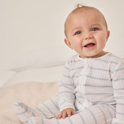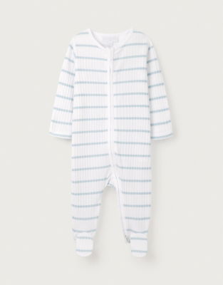 This sleepsuit is made with our new wide-rib fabric with extra stretch for added comfort. It's covered in blue and white stripes with contrasting trims and cuffs for a classic look. The easy zip fastening extends down one leg for fuss-free changing too.