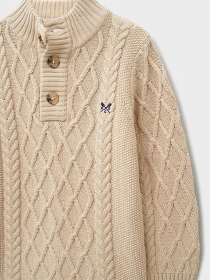 This jumper is perfect for transitional weather when extra warmth is needed. The oatmeal base provides a neutral backdrop for the intarsia-knitted cherry on the centre front while ivory contrast cuffs finish the look. Mock mother-of-pearl buttons on the shoulder placket make dressing easier and add detail to this cosy essential.
