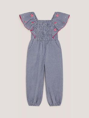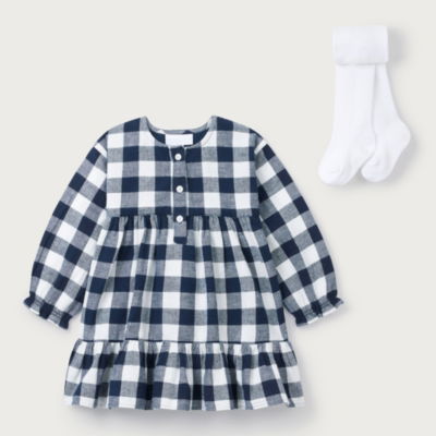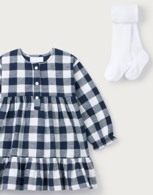 This charming gingham dress suits special occasions and everyday wear. The large navy-and-white-checked pattern adds a timeless touch while the double tiered hem creates movement with gentle gathers adding extra volume.