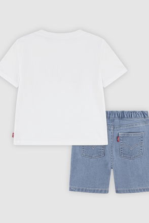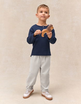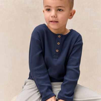 This charming two-piece outfit offers comfort and style for everyday adventures. The navy ribbed jersey top has a henley neckline with three branded mock-wood buttons.