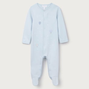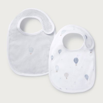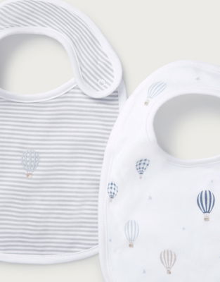 Float away with our adorable hot air balloon baby bibs. This two-pack features one all-over balloon print with blue stars on white and one blue striped bib with an embroidered hot air balloon. Crafted from organic cotton these bibs combine practicality with playful design for feeding.