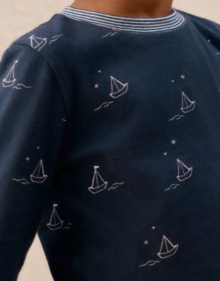 Set sail for sweet dreams with these navy pyjamas featuring a glow-in-the-dark boat print. Made from organic cotton these slim-fit pyjamas will make bedtime more exciting. Extendable cuffs let them grow with your little one making them practical for sleeping.