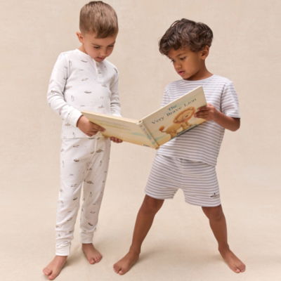 These boy sleepwear sets make bedtime an adventure. The lakehouse pair features rowing boats paddles and flags with a henley neckline while the second pair has soft blue striped shorties with paddle board embroidery.