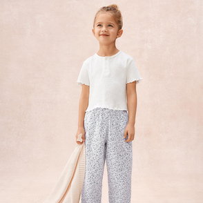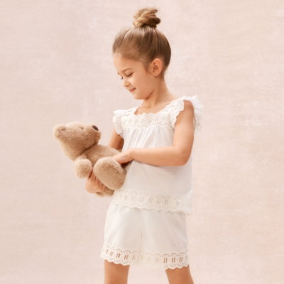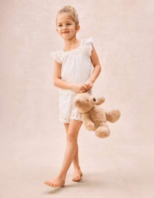 Our delightful shortie pyjamas feature beautiful broderie embroidery details around the hem and neckline for a touch of summer charm. Made from pure organic cotton poplin they're wonderfully soft against little ones' skin while they sleep or lounge. The top has pretty flutter sleeves and a practical button placket at the back making dressing easier. The boxer-style shorts complete the set with matching embroidery details for a coordinated look that's perfect for warmer nights.