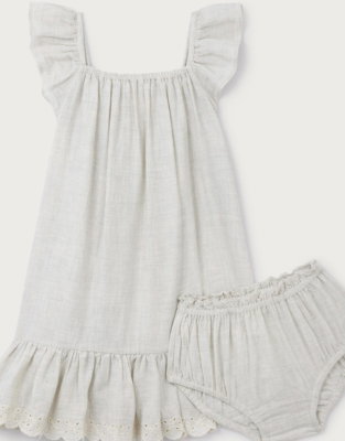 This beautiful dress is perfect for special occasions or summer days in the garden. Made from pure organic cotton this piece is wonderfully soft against delicate skin and lightweight enough for warm weather. The broderie anglaise detail along the hem adds a charming touch while the elasticated frill neckline makes dressing time easier. With its full flowy shape this piece is ideal for little ones who love to twirl and play. Pair with a cardigan for cooler days or let them wear it on its own when the sun is shining.