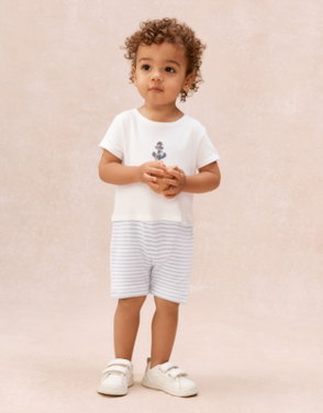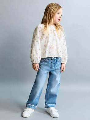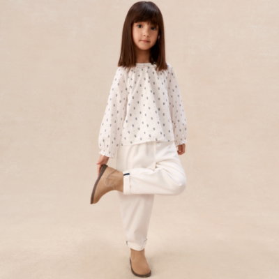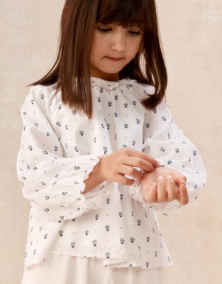 This charming two-piece set is perfect for everyday adventures and special occasions. The flowy white blouse features a navy daisy print interspersed with dots with frill detailing at the neckline and soft elasticated cuffs. The matching barrel-leg trousers have side pockets an elasticated waistband and rolled cuffs for a stylish finish.