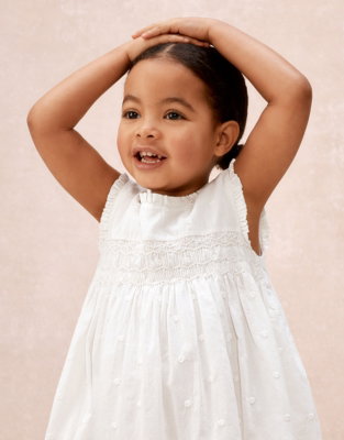 This charming white dress is perfect for special occasion wear or summer days in the garden. Made from pure organic cotton it features beautiful hand smocking across the centre front for a traditional touch.
