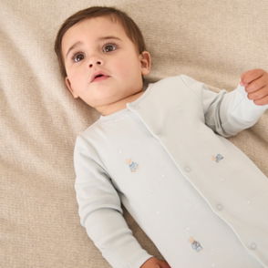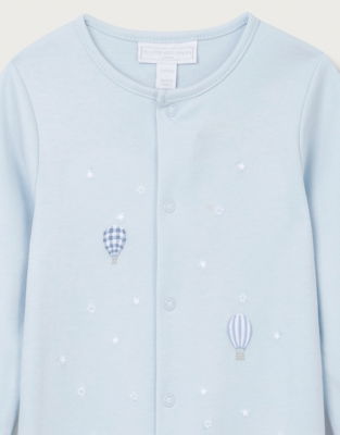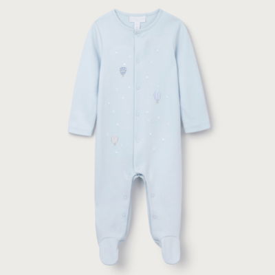 Drift off to dreamland with this charming hot air balloon baby sleepsuit. Featuring embroidered balloons on soft pale blue organic cotton this cosy outfit is gentle on delicate skin. The practical design includes front poppers for fuss-free changes and extendable cuffs that grow with your little explorer.
