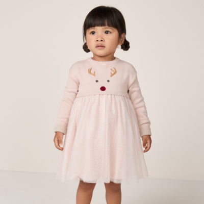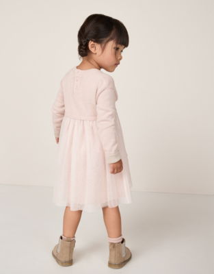 This shimmering party dress combines cosy comfort with a dash of sparkle. Made from super-soft organic cotton it features our favourite Jingles Reindeer embroidered on the front. We've added rolled cuffs and a layered tulle skirt adorned with gold glitter polka dots that catch the light beautifully. Great for Christmas day or for dancing at winter celebrations and parties.