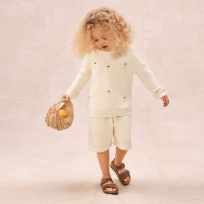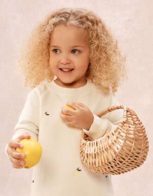 This charming sweatshirt is perfect for playdates trips to the park or cosy days at home. Made from super-soft pure organic cotton in a delightful pale yellow shade it features adorable embroidered lemons on the front that add a playful touch. The raglan sleeves give a more relaxed comfortable fit for little ones on the move. We love the practical popper placket at the back making it easy to put over their head. This delightful piece is finished with ribbed detailing at the neck hem and cuffs for a snug fit that keeps its shape making it an essential addition to any little one's wardrobe.