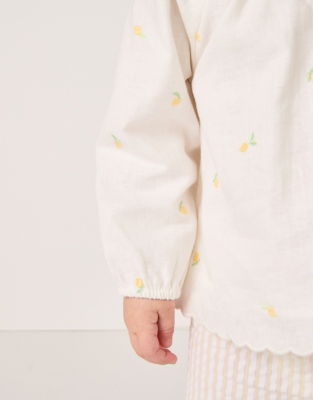 A fun summer-ready two-piece outfit for little ones. The balloon-sleeve top is made from a linen-and-organic-cotton blend which is lightweight and breathable and features a smocking detail dotted with embroidered lemons. Plus it's got a frill collar for playful detailing. With a super-comfortable elasticated waist the yellow-and-white-stripe bloomers have a slightly crinkled texture thanks to the seersucker finish of the pure-organic-cotton fabric.