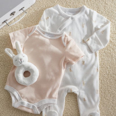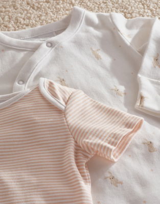 A really handy set for new arrivals. The sleepsuit is covered in our playful bunnies print and has a wrap design that making changing easy. Long-sleeved and footed it's great for keeping babies cosy. For warmer days and naptimes the bodysuit is short sleeved and leaves legs free to practise kicking. It has pretty pink-and-white stripes all over. This set also includes a bunny rattle great for sensory development for newborns.