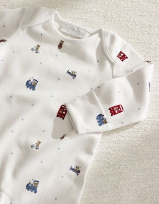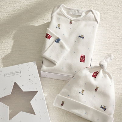 The sleepsuit-and-hat duo is an ideal gift for new arrivals. Made from soft pure organic cotton the sleepsuit and hat both feature the London-themed print. Join Charlie Bear on his travels in the big city as he hops on trains planes and double-decker buses to discover the city and make new friends.