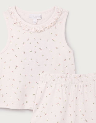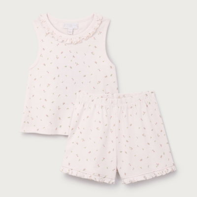 Our pretty pyjamas feature a classic vest top in pink with feminine frills around the neckline paired with matching shorts in our delicate Maya floral print. The shorts have sweet frill detailing along the bottom hem that coordinates perfectly with the top. Made from pure organic cotton that's gentle against young skin this set is ideal for keeping little ones cool and comfortable during warmer nights. These comfortable pieces are perfect for bedtime.