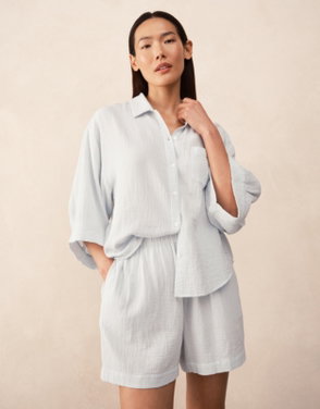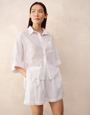 In soft cotton with all-over delicate broderie our shortie pyjama set is oversized with a wide boxy button-up top. The exaggerated dropped shoulders give it a contemporary relaxed look and the stepped hem adds a neat touch.