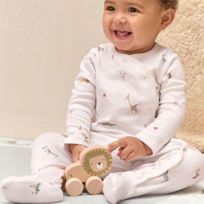 Get them cosy for bedtime with this party animal print sleepsuit. Soft organic cotton is gentle against delicate skin while the wrap style with front poppers makes changing easier. A playful unisex design makes this sleepsuit perfect for everyday wear or special nights.